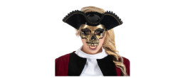 Ce masque de tête de mort pirate couleur doré avec chapeau tricorne velours en vente.