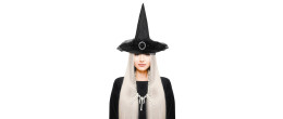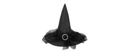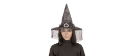 Chapeau de sorcière en nylon de couleur noir avec voilage en tulle étoilé, idéale pour compléter un déguisement de magicienne ou un costume de halloween.