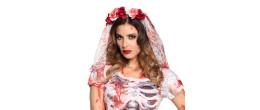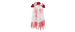 Voile de mariée luxe en dentelles blanche avec roses rouge et blanc ensanglantée en vente.