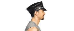 Casquette de biker, rockeur en simili cuir avec chaine en métal pour adulte. Idéale pour compléter un déguisement de Village People ou punk.