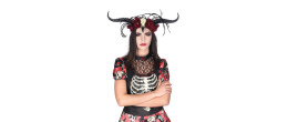 Serre tête vaudou avec crâne d'oiseau, plumes, fleurs et cornes en vente.
