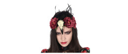 Bandeau vaudou avec crane d'oiseau, plumes et fleurs de couleur bordeaux en vente.