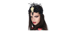 Bandeau vaudou avec crane d'oiseau, plumes et fleurs de couleur noire en vente.